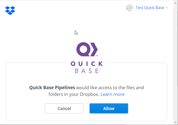 - You will be asked to allow Quickbase permission to access your Dropbox account, click Allow.