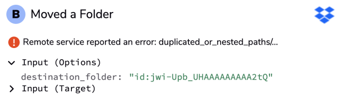 Moves a particular folder and its contents from one place to another. It functions similarly to Copy a Folder by supplying the Folder field with information that is either created or looked up by path/id in a previous step. Specify a location to move your folder to, in the Destination Folder field, or leave blank to use the root folder as the parent.* |